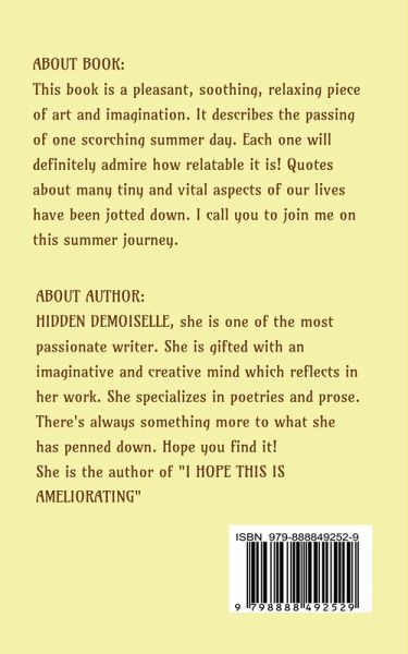 ""GOLDEN GLOWS FROM PLATINUM SKY"" is a book that describes the white mornings and silver summer sky through which the gleaming golden and intense rays scatter sleekly over this whole world, sowing various emotions and painting variegated colours which depict mutualism amongst people. Each one feels the summer, each one feels the heat, each one reacts the same. This book is a pleasant, soothing, relaxing piece of art and imagination. It describes the passing of one scorching summer day. Each one will definitely admire how relatable it is! Quotes about many tiny and vital aspects of our lives has been jotted down. I call you to join me on this summer journey.