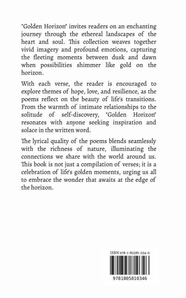 "Golden Horizon" invites readers on an enchanting journey through the ethereal landscapes of the heart and soul. This collection weaves together vivid imagery and profound emotions, capturing the fleeting moments between dusk and dawn when possibilities shimmer like gold on the horizon. With each verse, the reader is encouraged to explore themes of hope, love, and resilience, as the poems reflect on the beauty of life's transitions. From the warmth of intimate relationships to the solitude of self-discovery, "Golden Horizon" resonates with anyone seeking inspiration and solace in the written word. The lyrical quality of the poems blends seamlessly with the richness of nature, illuminating the connections we share with the world around us. This book is not just a compilation of verses; it is a celebration of life's golden moments, urging us all to embrace the wonder that awaits at the edge of the horizon.