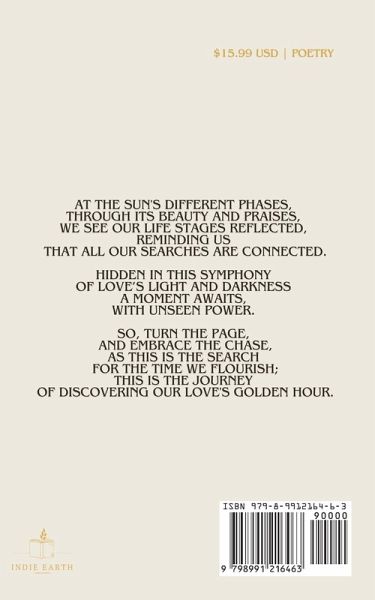 AT THE SUN'S DIFFERENT PHASES, THROUGH ITS BEAUTY AND PRAISES, WE SEE OUR LIFE STAGES REFLECTED, REMINDING US THAT ALL OUR SEARCHES ARE CONNECTED. HIDDEN IN THIS SYMPHONY OF LOVE'S LIGHT AND DARKNESS A MOMENT AWAITS, WITH UNSEEN POWER. SO, TURN THE PAGE, AND EMBRACE THE CHASE,AS THIS IS THE SEARCH FOR THE TIME WE FLOURISH;THIS IS THE JOURNEY OF DISCOVERING OUR LOVE'S GOLDEN HOUR.