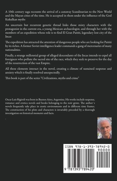 A 10th century saga recounts the arrival of a castaway Scandinavian to the New World and the Mayan cities of the time. He is accepted in them under the influence of the God Kukulkan myths An uncertain but recurrent genetic thread links those misty characters with the protagonist in the current era, a young Mexican archaeologist, and through her with the members of an expedition whose role is to find El Gran Paititi, legendary lost city of the Incas The expedition has attracted the attention of dangerous people who are looking for Paititi by its riches. A former Soviet intelligence leader commands a gang of mercenaries of many nationalities. Finally, a strange millennial group of alleged descendants of the Incas intends to expel all foreigners who pollute the sacred site of the race, which they seek to preserve for the day of the resurrection of the vast Empire. All these elements interact in the novel, creating a climate of sustained suspense and anxiety which is finally resolved unexpectedly. This book is part of the series "Civilizations, myths and crime"
