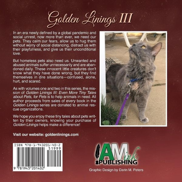 Even More Tiny Tales about Pets, for Pets is to help animals in need. All author proceeds from sales of every book in the Golden Linings series are donated to animal rescue organizations. We hope you enjoy these tiny tales about pets written by their owners, knowing your purchase of Golden Linings helps make a difference!