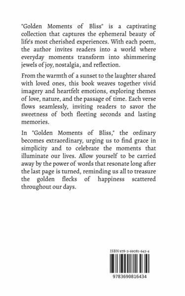 "Golden Moments of Bliss" is a captivating collection that captures the ephemeral beauty of life's most cherished experiences. With each poem, the author invites readers into a world where everyday moments transform into shimmering jewels of joy, nostalgia, and reflection. From the warmth of a sunset to the laughter shared with loved ones, this book weaves together vivid imagery and heartfelt emotions, exploring themes of love, nature, and the passage of time. Each verse flows seamlessly, inviting readers to savor the sweetness of both fleeting seconds and lasting memories. In "Golden Moments of Bliss," the ordinary becomes extraordinary, urging us to find grace in simplicity and to celebrate the moments that illuminate our lives. Allow yourself to be carried away by the power of words that resonate long after the last page is turned, reminding us all to treasure the golden flecks of happiness scattered throughout our days.