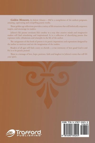 Golden Moments by Juliette Gleaton-Hill is a compilation of the author's poignant, amusing, captivating, and compelling poetic works. These golden-age reflections provide a variety of life situations that will holistically empower, inspire, and encourage its readers. Juliette's life poems envision life's totality in a way that creative minds and imaginative readers will find stimulating and inspirational. It is a collection of electrifying poems that expresses trials, tribulations, and triumphs in the life of the author. The uniqueness of this book of poems is its poetic impressions and expressions designed by the author to motivate and stir the imagination of the readers. Readers of all ages will find a story to cherish-a true testimony of how good God is and how He is to be greatly praised. There is a message of love, hope, patience, faith, and laughter in Juliette's verses that will lift your spirit.