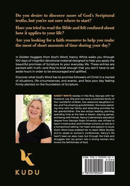 Do you desire to discover more of God's Scriptural truths, but you're not sure where to start? Have you tried to read the Bible and felt confused about how it applies to your life? Are you looking for a faith resource to help you make the most of short amounts of time during your day? In Golden Nuggets from God's Word, Nancy White walks you through 100 days of insightful devotional material designed to help you apply the beautiful promises of Scripture to your everyday life. These entries are packed with truth-and they're brief enough that you don't have to set aside hours in order to be encouraged and uplifted. Discover what God's Word has to promise followers of Christ in a myriad of situations, life circumstances, and events...and face your day feeling firmly planted on the foundation of Scripture.