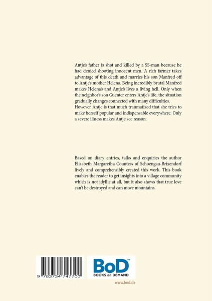 Antje's father is shot and killed by a SS-man because he had denied shooting innocent men. A rich farmer takes advantage of this death and marries his son Manfred off to Antje's mother Helena. Being incredibly brutal Manfred makes Helena's and Antje's lives a living hell. Only when the neighbor's son Guenter enters Antje's life, the situation gradually changes connected with many difficulties.However Antje is that much traumatized that she tries to make herself popular and indispensable everywhere. Only a severe illness makes Antje see reason.Based on diary entries, talks and enquiries the author Elisabeth Margaretha Countess of Schoengau-Brixendorf lively and comprehensibly created this work. This book enables the reader to get insights into a village community which is not idyllic at all, but it also shows that true love can't be destroyed and can move mountains.