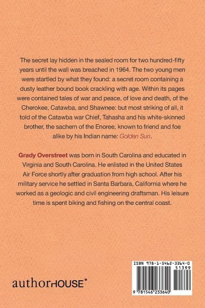 The secret lay hidden in the sealed room for two hundred-fifty years until the wall was breached in 1964. The two young men were startled by what they found: a secret room containing a dusty leather bound book crackling with age. Within its pages were contained tales of war and peace, of love and death, of the Cherokee, Catawba, and Shawnee: but most striking of all, it told of the Catawba war Chief, Tahasha and his white-skinned brother, the sachem of the Enoree, known to friend and foe alike by his Indian name: Golden Sun.