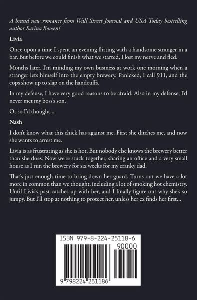 A brand new romance from Wall Street Journal and USA Today bestselling author Sarina Bowen! Livia Once upon a time I spent an evening flirting with a handsome stranger in a bar. But before we could finish what we started, I lost my nerve and fled. Months later, I'm minding my own business at work one morning when a stranger lets himself into the empty brewery. Panicked, I call 911, and the cops show up to slap on the handcuffs. In my defense, I have very good reasons to be afraid. Also in my defense, I'd never met my boss's son. Or so I'd thought... Nash I don't know what this chick has against me. First she ditches me, and now she wants to arrest me. Livia is as frustrating as she is hot. But nobody else knows the brewery better than she does. Now we're stuck together, sharing an office and a very small house as I run the brewery for six weeks for my cranky dad. That's just enough time to bring down her guard. Turns out we have a lot more in common than we thought, including a lot of smoking hot chemistry. Until Livia's past catches up with her, and I finally figure out why she's so jumpy. But I'll stop at nothing to protect her, unless her ex finds her first...