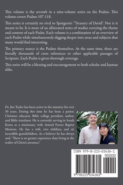 This volume is the seventh in a nine-volume series on the Psalms. This volume covers Psalms 107-118. This series is certainly no rival to Spurgeon's "Treasury of David". Nor is it meant to be. It is more of an alliterated series of studies covering the theme and content of each Psalm. Each volume is a combination of an overview of each Psalm while simultaneously digging deeper into areas and subjects that many would find interesting. The primary source is the Psalms themselves. At the same time, there are literally thousands of cross references to other applicable passages of Scripture. Each Psalm is given thorough coverage. This series will be a blessing and encouragement to both scholar and layman alike.