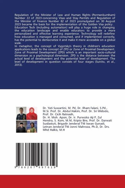 Regulation of the Minister of Law and Human Rights (Permenkumham) Number 22 of 2023 concerning Visas and Stay Permits and Regulation of the Minister of Finance Number 82 of 2023 promulgated on 30 August 2023 became the basis for the implementation of the Golden Visa policy . Education Tech (including automation) will play a huge role in changing the education landscape and enable educators to provide a more personalized and effective learning experience. Technology will redefine how education is managed and consumed, and if implemented correctly, has the potential to democratize it and make it more accessible on a global scale.In metaphor, the concept of Vygotsky's theory in children's education applications leads to the concept of ZPD or Zone of Proximal Development. Zone of Proximal Development (ZPD) which is an important socio-cultural dimension as a psychological dimension. ZPD is the distance between the actual level of development and the potential level of development. Thelevel of development in question consists of four stages (Sunito, et al., 2013).