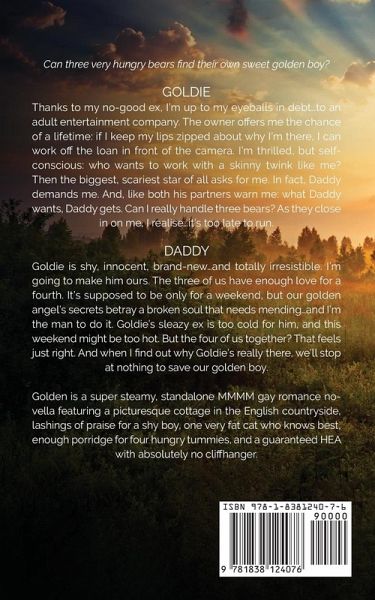 Can three very hungry bears find their own sweet golden boy? GOLDIEThanks to my no-good ex, I'm up to my eyeballs in debt...to an adult entertainment company. The owner offers me the chance of a lifetime: if I keep my lips zipped about why I'm there, I can work off the loan in front of the camera. I'm thrilled, but self-conscious: who wants to work with a skinny twink like me? Then the biggest, scariest star of all asks for me. In fact, Daddy demands me. And, like both his partners warn me: what Daddy wants, Daddy gets. Can I really handle three bears? As they close in on me, I realise...it's too late to run. DADDYGoldie is shy, innocent, brand-new...and totally irresistible. I'm going to make him ours. The three of us have enough love for a fourth. It's supposed to be only for a weekend, but our golden angel's secrets betray a broken soul that needs mending...and I'm the man to do it. Goldie's sleazy ex is too cold for him, and this weekend might be too hot. But the four of us together? That feels just right. And when I find out why Goldie's really there, we'll stop at nothing to save our golden boy. Golden is a super steamy, standalone MMMM gay romance novella featuring a picturesque cottage in the English countryside, lashings of praise for a shy boy, one very fat cat who knows best, enough porridge for four hungry tummies, and a guaranteed HEA with absolutely no cliffhanger.