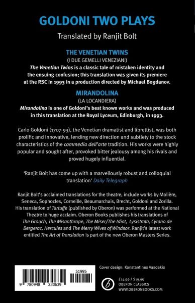 In the year of the bicentenary of the death of Carlo Goldoni, one of Italy's most brilliant dramatists, two of his greatest comedies are brought to life in Ranjit Bolt's vibrant translations. The Venetian Twins is a classic tale of mistaken identity and the ensuing confusion. The play was given its premiere at the Royal Shakespeare Company in a production directed by Michael Bogdanov which enjoyed huge success in Stratford and London. Mirandolina is one of Goldoni's best known works and this translation was produced at the Royal Lyceum, Edinburgh.