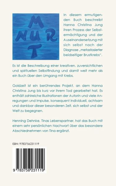 In diesem ermutigenden Buch beschreibt Hanna Christina Jung ihren Prozess der Selbstermächtigung und der Auseinandersetzung mit sich selbst nach der Diagnose metastasierter beidseitiger Brustkrebs. Es ist die Beschreibung einer kreativen, zuversichtlichen und spirituellen Selbstfindung und damit weit mehr als ein Buch über den Umgang mit Krebs.Goldzeit ist ein berührendes Projekt, an dem Hanna Christina Jung bis kurz vor ihrem Tod gearbeitet hat. Es enthält zahlreiche Illustrationen der Autorin und viele Anregungen und Impulse, konsequent individuell, achtsam und dankbar dieser besonderen Zeit, sich selbst und der Welt zu begegnen.Henning Dehnke, Tinas Lebenspartner, hat das Buch mit einem sehr persönlichen Nachwort über das besondere Abschiednehmen von Tina ergänzt.