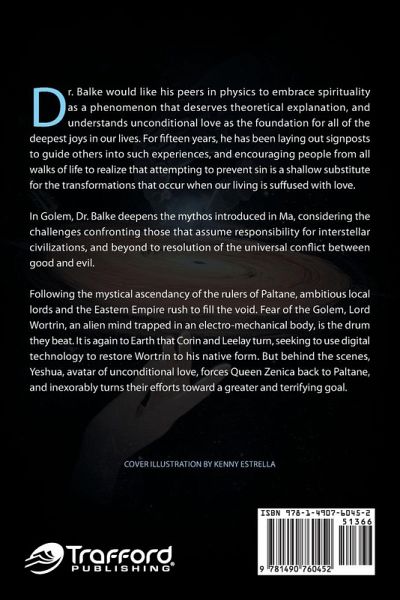 In Golem, Dr. Balke deepens the mythos introduced in Ma, considering the challenges confronting those that assume responsibility for interstellar civilizations, and beyond to resolution of the universal conflict between good and evil. Following the mystical ascendancy of the rulers of Paltane, ambitious local lords and the Eastern Empire rush to fill the void. Fear of the Golem, Lord Wortrin, an alien mind trapped in an electro-mechanical body, is the drum they beat. It is again to Earth that Corin and Leelay turn, seeking to use digital technology to restore Wortrin to his native form. But behind the scenes, Yeshua, avatar of unconditional love, forces Queen Zenica back to Paltane, and inexorably turns their efforts toward a greater and terrifying goal.