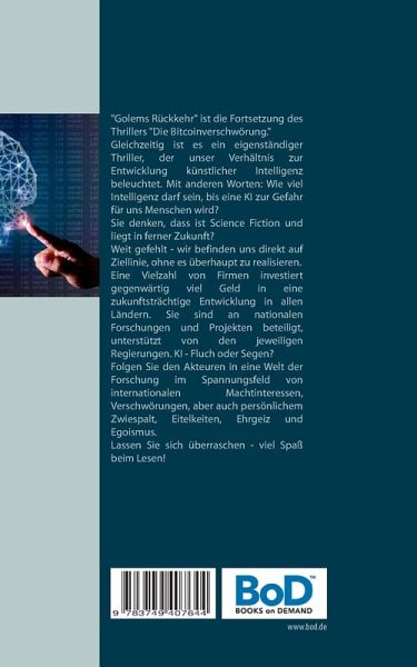 "Golems Rückkehr" ist die Fortsetzung des Thrillers "Die Bitcoinverschwörung."Gleichzeitig ist es ein eigenständiger Thriller, der unser Verhältnis zur Entwicklung künstlicher Intelligenz beleuchtet. Mit anderen Worten: Wie viel Intelligenz darf sein, bis eine KI zur Gefahr für uns Menschen wird? Sie denken, dass ist Science Fiction und liegt in ferner Zukunft?Weit gefehlt - wir befinden uns direkt auf Ziellinie, ohne es überhaupt zu realisieren.Eine Vielzahl von Firmen investiert gegenwärtig viel Geld in eine zukunftsträchtige Entwicklung in allen Ländern. Sie sind an nationalen Forschungen und Projekten beteiligt, unterstützt von den jeweiligen Regierungen. KI - Fluch oder Segen?Folgen Sie den Akteuren in eine Welt der Forschung im Spannungsfeld von internationalen Machtinteressen, Verschwörungen, aber auch persönlichem Zwiespalt, Eitelkeiten, Ehrgeiz und Egoismus.Lassen Sie sich überraschen - viel Spaß beim Lesen!