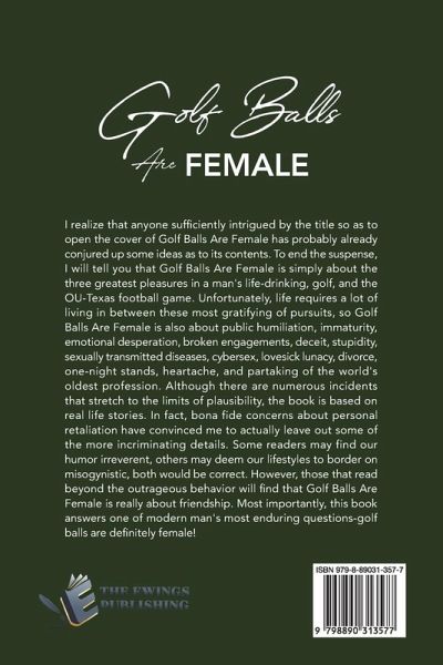 I realize that anyone sufficiently intrigued by the title so as to open the cover of Golf Balls Are Female has probably already conjured up some ideas as to its contents. To end the suspense, I will tell you that Golf Balls Are Female is simply about the three greatest pleasures in a man's life-drinking, golf, and the OU-Texas football game. Unfortunately, life requires a lot of living in between these most gratifying of pursuits, so Golf Balls Are Female is also about public humiliation, immaturity, emotional desperation, broken engagements, deceit, stupidity, sexually transmitted diseases, cybersex, lovesick lunacy, divorce, one-night stands, heartache, and partaking of the world's oldest profession. Although there are numerous incidents that stretch to the limits of plausibility, the book is based on real life stories. In fact, bona fide concerns about personal retaliation have convinced me to actually leave out some of the more incriminating details. Some readers may find our humor irreverent, others may deem our lifestyles to border on misogynistic, both would be correct. However, those that read beyond the outrageous behavior will find that Golf Balls Are Female is really about friendship. Most importantly, this book answers one of modern man's most enduring questions-golf balls are definitely female!
