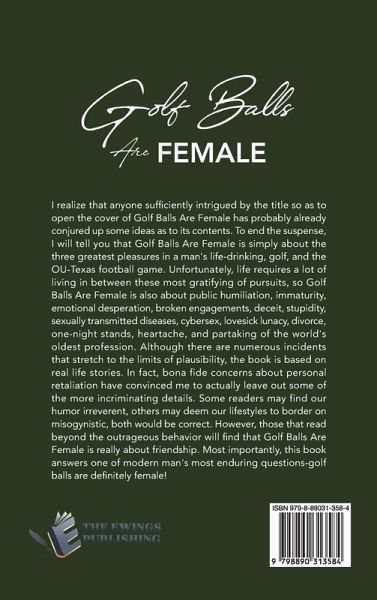 I realize that anyone sufficiently intrigued by the title so as to open the cover of Golf Balls Are Female has probably already conjured up some ideas as to its contents. To end the suspense, I will tell you that Golf Balls Are Female is simply about the three greatest pleasures in a man's life-drinking, golf, and the OU-Texas football game. Unfortunately, life requires a lot of living in between these most gratifying of pursuits, so Golf Balls Are Female is also about public humiliation, immaturity, emotional desperation, broken engagements, deceit, stupidity, sexually transmitted diseases, cybersex, lovesick lunacy, divorce, one-night stands, heartache, and partaking of the world's oldest profession. Although there are numerous incidents that stretch to the limits of plausibility, the book is based on real life stories. In fact, bona fide concerns about personal retaliation have convinced me to actually leave out some of the more incriminating details. Some readers may find our humor irreverent, others may deem our lifestyles to border on misogynistic, both would be correct. However, those that read beyond the outrageous behavior will find that Golf Balls Are Female is really about friendship. Most importantly, this book answers one of modern man's most enduring questions-golf balls are definitely female!