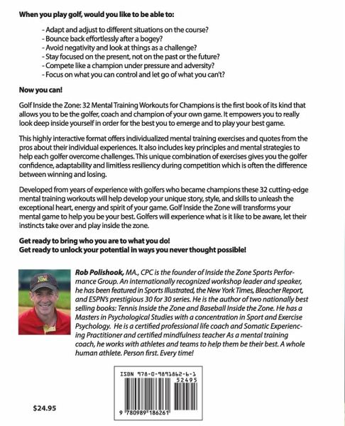 Golf Inside the Zone: 32 Mental Training Workouts for Champions is the first book of its kind that allows you to be the golfer, coach and champion of your own game. It empowers you to really look deep inside yourself in order for the best you to emerge and to play your best game. When you golf, would you like to be able to: - Adapt and adjust to different situations on the course? - Bounce back effortlessly after a bogey? - Avoid negativity and look at things as a challenge? - Stay focused on the present, not on the past or the future? - Compete like a champion under pressure and adversity? - Focus on what you can control and let go of what you can't? This highly interactive format offers individualized mental training exercises and quotes from the pros about their individual experiences. It also includes key principles and mental strategies to help each golfer overcome challenges. This unique combination of exercises gives you the golfer confidence, adaptability and limitless resiliency during competition which is often the difference between winning and losing. Developed from years of experience with golfers who became champions these 32 cutting-edge mental training workouts will help develop your unique story, style, and skills to unleash the exceptional heart, energy and spirit of your game. Golf Inside the Zone will transforms your mental game to help you be your best. Golfers will experience what is it like to be aware, let their instincts take over and play inside the zone. Get ready to bring who you are to what you do! Get ready to unlock your potential in ways you never thought possible!