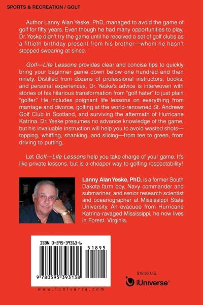 Author Lanny Alan Yeske, PhD, managed to avoid the game of golf for fifty years. Even though he had many opportunities to play, Dr. Yeske didn't try the game until he received a set of golf clubs as a fiftieth birthday present from his brother-whom he hasn't stopped swearing at since. Golf-Life Lessons provides clear and concise tips to quickly bring your beginner game down below one hundred and then ninety. Distilled from dozens of professional instructors, books, and personal experiences, Dr. Yeske's advice is interwoven with stories of his hilarious transformation from "golf hater" to just plain "golfer." He includes poignant life lessons on everything from marriage and divorce, golfing at the world-renowned St. Andrews Golf Club in Scotland, and surviving the aftermath of Hurricane Katrina. Dr. Yeske presumes no advance knowledge of the game, but his invaluable instruction will help you to avoid wasted shots-topping, whiffing, shanking, and slicing-from tee to green, from driving to putting. Let Golf-Life Lessons help you take charge of your game. It's like private lessons, but is a cheaper way to golfing respectability!