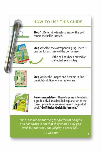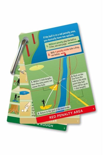 Rules knowledge always at your fingertips on your golf bag. "Golf Rules TO GO" provides answers to rules questions in the most practical way-in the form of a bag tag. All the important rules of golf are summarized on nine easy-to-understand waterproof cards. Each area of the golf course (tee, penalty area, green, etc.) is covered on one single card which systematically shows what is "allowed/not allowed". In addition, the most common dropping procedures are explained with clear illustrations so that you can understand them at a glance, even under time pressure during the round. The cards can be easily attached to your golf bag thanks to a snap hook; the rules information is thus always to hand.The creator of this practical aid is referee and bestselling author Yves C. Ton-That. His "Golf Rules Quick Reference" pocket guide has won several awards and sold over 2.5 million copies. Now he has pulled off another coup with this innovative bag tag. "Golf Rules TO GO" ensures greater certainty and clarity on the course and belongs on every golf bag.
