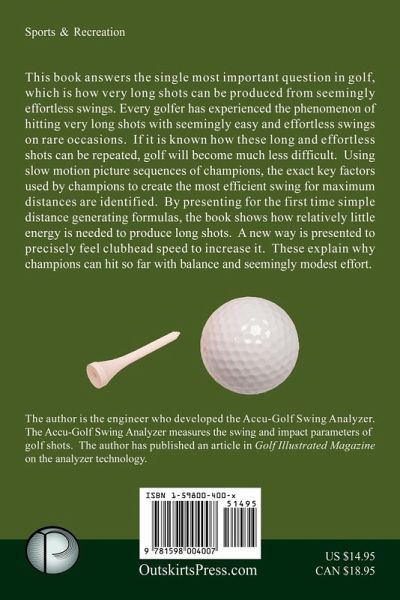 New formula for effortlessly reaching any greens in regulation This book answers the single most important question in golf, which is how very long shots can be produced from seemingly effortless swings. Every golfer has experienced the phenomenon of hitting very long shots with seemingly easy and effortless swings on rare occasions. If it is known how these long and effortless shots can be repeated, golf will become much less difficult. Using slow motion picture sequences of champions, the exact key factors used by champions to create the most efficient swing for maximum distances are identified. By presenting for the first time simple distance generating formulas, the book shows how relatively little energy is needed to produce long shots. A new way is presented to precisely feel clubhead speed to increase it. These explain why champions can hit so far with balance and seemingly modest effort.