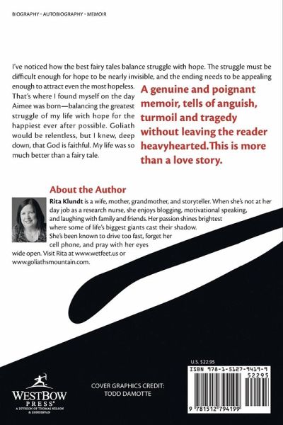 "There is no such thing as a prince charming or fairy godmother, but believe me, there are plenty of goliaths out there." That’s what her father said, when late one night a sleepy little girl fortuitously married the lead characters in the telling of her two favorite stories. The way she told it, Cinderella (of the classic fairy tale) and David (as in David and Goliath) lived together "happily-everafter." As a teenager, she thought perhaps her father had been wrong. How else could it be possible for such an intriguing and handsome boy to fall in love with her, an average girl? This powerful memoir gives the reader an intimate view inside the hearts of grieving and hurting people. Rita’s untainted candor and occasional use of humor turns a personal tragedy into an inspirational how-to, and sometimes a how-not-to, learning experience. Goliath’s Mountain is a fictitious name, but the giants you meet in this book are painfully real. Her father was right, but Rita finds hope and a good life—right here on Goliath’s Mountain.