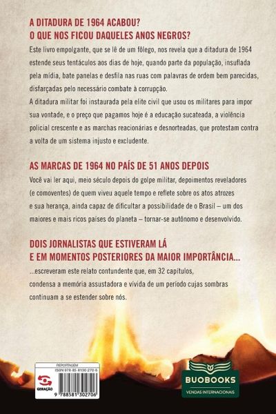 A DITADURA DE 1964 ACABOU? O QUE NOS FICOU DAQUELES ANOS NEGROS? Este livro empolgante, que se lê de um fôlego, nos revela que a ditadura de 1964 estende seus tentáculos aos dias de hoje, quando parte da população, insuflada pela mídia, bate panelas e desfila nas ruas com palavras de ordem bem parecidas, disfarçadas pelo necessário combate à corrupção. A ditadura militar foi instaurada pela elite civil que usou os militares para impor sua vontade, e o preço que pagamos hoje é a educação sucateada, a violência policial crescente e as marchas reacionárias e desnorteadas, que protestam contra a volta de um sistema injusto e excludente. AS MARCAS DE 1964 NO PAÍS DE 51 ANOS DEPOIS. Você vai ler aqui, meio século depois do golpe militar, depoimentos reveladores (e comoventes) de quem viveu aquele tempo e reflete sobre os atos atrozes e sua herança, ainda capaz de dificultar a possibilidade de o Brasil ¿ um dos maiores e mais ricos países do planeta ¿ tornar-se autônomo e desenvolvido. DOIS JORNALISTAS QUE ESTIVERAM LÁ E EM MOMENTOS POSTERIORES DA MAIOR IMPORTÂNCIA¿escreveram este relato contundente que, em 32 capítulos, condensa a memória assustadora e vívida de um período cujas sombras continuam a se estender sobre nós.