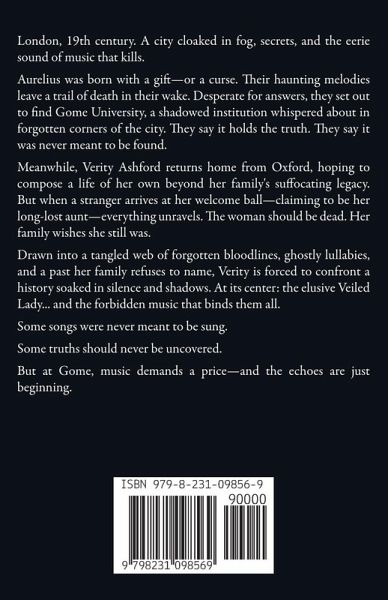 London, 19th century. A city cloaked in fog, secrets, and the eerie sound of music that kills. Aurelius was born with a gift-or a curse. Their haunting melodies leave a trail of death in their wake. Desperate for answers, they set out to find Gome University, a shadowed institution whispered about in forgotten corners of the city. They say it holds the truth. They say it was never meant to be found. Meanwhile, Verity Ashford returns home from Oxford, hoping to compose a life of her own beyond her family's suffocating legacy. But when a stranger arrives at her welcome ball-claiming to be her long-lost aunt-everything unravels. The woman should be dead. Her family wishes she still was. Drawn into a tangled web of forgotten bloodlines, ghostly lullabies, and a past her family refuses to name, Verity is forced to confront a history soaked in silence and shadows. At its center: the elusive Veiled Lady... and the forbidden music that binds them all. Some songs were never meant to be sung. Some truths should never be uncovered. But at Gome, music demands a price-and the echoes are just beginning.