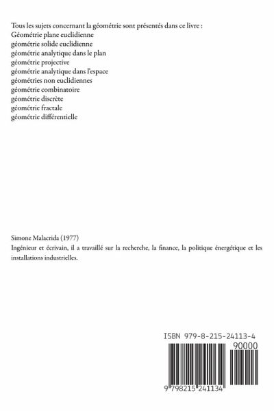 Tous les sujets concernant la géométrie sont présentés dans ce livre : Géométrie plane euclidienne géométrie solide euclidienne géométrie analytique dans le plan géométrie projective géométrie analytique dans l'espace géométries non euclidiennes géométrie combinatoire géométrie discrète géométrie fractale géométrie différentielle