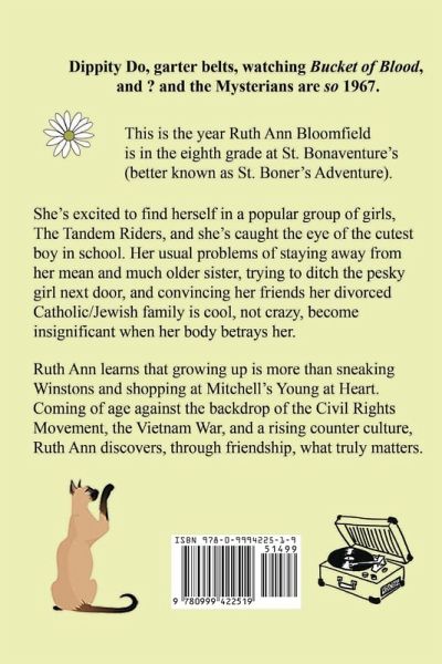 Dippity-Do, garter belts, Bucket of Blood, and ? and the Mysterians are so 1967. This is the year Ruth Ann Bloomfield is in the eighth grade at St. Bonaventure’s (better known as St. Boner’s Adventure). She’s excited to find herself in a popular group of girls, The Tandem Riders, and has caught the eye of the cutest boy in school. Her usual problems of staying away from her mean and much older sister, trying to ditch the pesky girl next door, and convincing her friends that her divorced Catholic/Jewish family is cool, not crazy become insignificant when her body betrays her. Ruth Ann learns that growing up is more than sneaking Winstons and shopping at Mitchell’s Young at Heart. Coming of age against the backdrop of the Civil Rights Movement, the Vietnam War, and a rising counter culture, Ruth Ann discovers, through friendship, what truly matters. This book is filled with iconic music references and great attention to vintage era-specific detail. This will appeal to young adult readers as well as adults who grew up in this era. With gentle humor, the story of Ruth Ann tackles difficult subjects such as body image, self-esteem, and sexual pressure. Most importantly, this is the story of a girl with Psoriasis. This disease causes not just skin sores, itching, and irritation. Psoriasis also leads to depression, shame, anxiety, and can even result in suicide. While there are better options today for treatment, in 1967, the treatments were primitive and ineffective. Most people had to wait it out and many got no relief at all. Ruth Ann learns that being a good friend is more important than how she looks or even how she feels. She searches for companionship and belonging to compensate for the lack of nurturing she gets from her divorced family. The added pressure of hiding her skin causes enormous tension in her relationships and life. Ruth Ann is a believable and relatable character for young and not-so-young readers alike. This book is filled with quirky, funny people offsetting a very serious topic. It is a touching and enjoyable read.