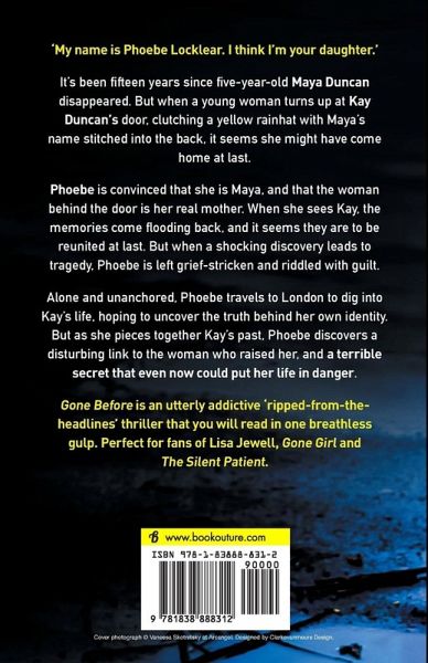 'My name is Phoebe Locklear. I think I'm your daughter.' It's been fifteen years since five-year-old Maya Duncan disappeared. But when a young woman turns up at Kay Duncan's door, clutching a yellow rainhat with Maya's name stitched in the back, it seems she might have come home at last. Phoebe is convinced that she is Maya, and that the woman behind the door is her real mother. When she sees Kay, the memories come flooding back, and it seems they are to be reunited at last. But when a shocking discovery leads to tragedy, Phoebe is left grief-stricken and riddled with guilt. Alone and unanchored, Phoebe travels to London to dig into Kay's life, hoping to uncover the truth behind her own identity. But as she pieces together Kay's past, Phoebe discovers a disturbing link to the woman who raised her, and a terrible secret that even now could put her life in danger. Gone Before is an utterly addictive 'ripped-from-the-headlines' thriller that you will read in one breathless gulp. Perfect for fans of Lisa Jewell, Gone Girl and The Silent Patient. What readers are saying about Gone Before: 'I can't remember when I last read a book with so many twists and turns. Wow!... This book kept me captivated, and I had to finish it in one go… This was the first book by Sam Hepburn I've read, but it won't be the last.' The World is Ours to Read, ¿¿¿¿¿ 'Gone Before does not compare to any book I've read before! After the first two chapters I was hooked! 60% through I was enchanted. This is one of those suspenseful, addictive stories that has to be read in one sitting.' Netgalley Reviewer, ¿¿¿¿¿ 'Exquisite. Perfect from start to finish. Addictive. Charged. Suspenseful. A masterpiece. Highly recommend this to everyone. Five stars are not enough. One of the best thrillers I have ever read.' Renita D'Silva, ¿¿¿¿¿ 'From the first chapter I just knew I was going to love this twisty thriller . This is a must read for fans of psychological thriller books.' Goodreads Reviewer, ¿¿¿¿¿ 'An absolutely fantastic read… both gripping and addictive… the author has definitely kept me guessing. A definite five-star read, I highly recommend this book.' Little Miss Book Lover 87, ¿¿¿¿¿ 'This is a terrific book! Took my interest from page 1 and I read it in a day, really well written and a fab page turner!' Netgalley Reviewer, ¿¿¿¿¿ 'Caught my attention from the first page and all I wanted to do was keep reading to the end… Sam Hepburn is a new author for me and I definitely will be checking out more by her.' Goodreads Reviewer¿¿¿¿¿ 'An intensely emotional domestic thriller with many twists and turns… Superbly plotted, this novel will have you alternatively rooting for Phoebe and for Kay, two characters who are very well developed. Definitely a novel that I shall recommend and pass on to my friends!' Goodreads Reviewer, ¿¿¿¿¿