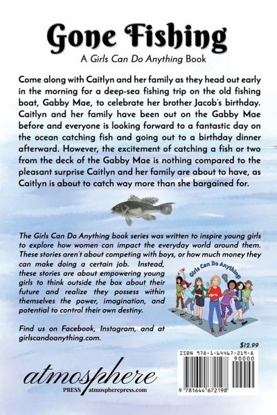 Come along with Caitlyn and her family as they head out early in the morning for a deep-sea fishing trip on the old fishing boat, Gabby Mae, to celebrate her brother Jacob's birthday. Caitlyn and her family have been out on the Gabby Mae before and everyone is looking forward to a fantastic day on the ocean catching fish and going out to a birthday dinner afterward. However, the excitement of catching a fish or two from the deck of the Gabby Mae is nothing compared to the pleasant surprise Caitlyn and her family are about to have, as Caitlyn is about to catch way more than she bargained for. The Girls Can Do Anything book series was written to inspire young girls to explore how women can impact the everyday world around them. These stories aren't about competing with boys, or how much money they can make doing a certain job. Instead, these stories are about empowering young girls to think outside the box about their future and realize they possess within themselves the power, imagination, and potential to control their own destiny. Find us on Facebook, Instagram, and at girlscandoanything.com.