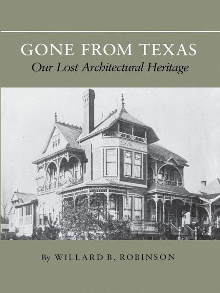 The architecture of an area reflects and indeed embodies its history. When a significant portion of that architecture is lost, so is the grasp later generations have on their heritage. With more than 250 historical photographs and drawings and thoughtful commentary, Willard Robinson recaptures for Texans the cultural history of their state through the architecture that is gone. This handsome volume is unique in picturing comprehensively both public and private buildings and in illustrating the entire history of the state's architecture, unhindered by the difficulties of finding extant examples. It traces the architectural development of the state from Indian dwellings and Hispanic-colonial structures through the early twentieth century. It details the diverse influences on the built environment introduced by settlers from various origins--Germany, France, the Southeast United States. It shows how evolutions in technology and taste following the Civil War affected architecture, and it explores the Victorian splendor of the nineteenth century's era of elegance. Moreover, Robinson, relying heavily on primary sources, sets architectural trends in the context of the social, economic, and aesthetic forces that gave rise to them. His emphasis on the significance of lost architecture presents a powerful appeal for preservation of the important works that remain. Robinson has traveled widely through the state, visiting the sites of lost buildings, viewing remains, gathering photographs, and obtaining information. The result is a beautiful history of the architecture of Texas, from a perspective that might otherwise have been lost with the buildings.