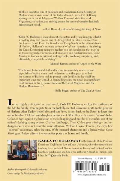 In her anticipated second novel, Karla Holloway evokes the resilience of a family whose journey traces the river of America’s early twentieth century. The Mosby family, like other thousands, migrate from the loblolly-scented Carolinas north to the Harlem of their aspirations—with its promise of freedom and opportunities, sunlit boulevards, and elegant societies. The family arrives as Harlem staggers under the flu pandemic that follows the First World War. DeLilah Mosby and her daughter, Selma, meet difficulties with backbone and resolve to make a home for themselves in the city, and Selma has a baby, Chloe. As the Great Depression creeps across the world at the close of the twenties, however, the farsighted see hard times coming. The panic of the early thirties is embodied in the kidnapping and murder of the infant son of the nation’s dashing young aviator, Charles Lindbergh. A transfixed public follows the manhunt in the press and on the radio. Then Chloe goes missing—but her disappearance does not draw the same attention. Wry and perceptive Weldon Haynie Thomas, the city’s first “colored” policeman, takes the case. The urgent investigation tests Thomas’s abilities to draw out the secrets Harlem harbors, untangling the color-coded connections and relationships that keep company with greed, ghosts, and grief. With nuanced characters, lush historical detail, and a lyrical voice, Gone Missing in Harlem affirms the restoring powers of home and family.