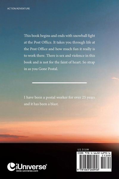 This book begins and ends with snowball fight at the Post Office. It takes you through life at the Post Office and how much fun it really is to work there. There is sex and violence in this book and is not for the faint of heart. So strap in as you Gone Postal.