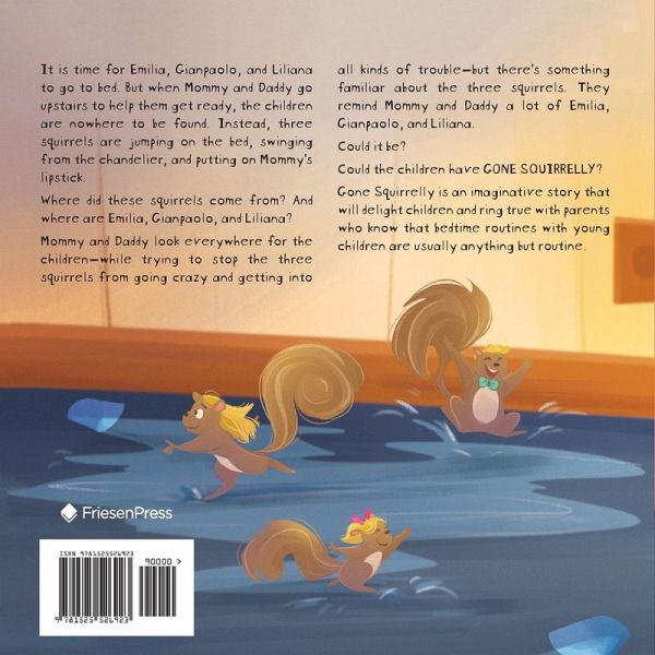 It is time for Emilia, Gianpaolo, and Liliana to go to bed. But when Mommy and Daddy go upstairs to help them get ready, the children are nowhere to be found. Instead, three squirrels are jumping on the bed, swinging from the chandelier, and putting on Mommy's lipstick. Where did these squirrels come from? And where are Emilia, Gianpaolo, and Liliana? Mommy and Daddy look everywhere for the children-while trying to stop the three squirrels from going crazy and getting into all kinds of trouble-but there's something familiar about the three squirrels. They remind Mommy and Daddy a lot of Emilia, Gianpaolo, and Liliana. Could it be? Could the children have GONE SQUIRRELLY? Gone Squirrelly is an imaginative story that will delight children and ring true with parents who know that bedtime routines with young children are usually anything but routine.