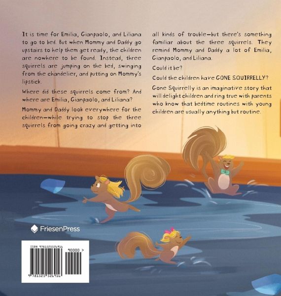 It is time for Emilia, Gianpaolo, and Liliana to go to bed. But when Mommy and Daddy go upstairs to help them get ready, the children are nowhere to be found. Instead, three squirrels are jumping on the bed, swinging from the chandelier, and putting on Mommy's lipstick. Where did these squirrels come from? And where are Emilia, Gianpaolo, and Liliana? Mommy and Daddy look everywhere for the children-while trying to stop the three squirrels from going crazy and getting into all kinds of trouble-but there's something familiar about the three squirrels. They remind Mommy and Daddy a lot of Emilia, Gianpaolo, and Liliana. Could it be? Could the children have GONE SQUIRRELLY? Gone Squirrelly is an imaginative story that will delight children and ring true with parents who know that bedtime routines with young children are usually anything but routine.