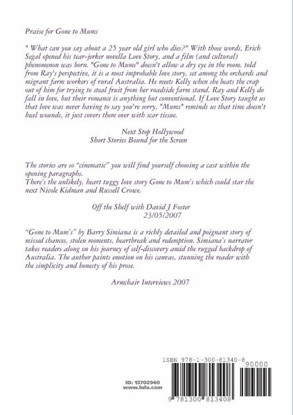 " What can you say about a twenty five year old girl who died?" With those words, Erich Segal opened his tear-jerker novella Love Story, and a film (and cultural) phenomenon was born. "Gone to Mums" doesn't allow a dry eye in the room. Told from Ray's perspective, it is a most improbable love story, set among the orchards and migrant farmers of rural Australia. He meets Kelly when she beats the crap out of him for trying to steal fruit from her roadside farm stand. Ray and Kelly do fall in love, but their romance is anything but conventional. If Love Story taught us that love was never having to say sorry, "Mums" reminds us that time doesn't heal wounds, it just covers them over with scar tissue.