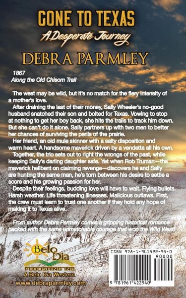 1867 Along the Old Chisholm Trail The West may be wild, but it's no match for the fiery intensity of a mother's love. After draining the last of their money, Sally Wheeler's no-good husband snatched their son and bolted for Texas. Vowing to stop at nothing to get her boy back, she hits the trails to track him down. But she can't do it alone. Sally partners up with two men to better her chances of surviving the perils of the prairie. Her friend, an old mule skinner with a salty disposition and warm heart. A handsome maverick, driven by a vendetta all his own. Together, the trio sets out to right the wrongs of the past, while keeping Sally's darling daughter safe. Yet when Rob Truman-the maverick hellbent on claiming revenge-discovers he and Sally are hunting the same man, he's torn between his desire to settle a score and his growing passion for her. Despite their feelings, budding love will have to wait. Flying bullets. Harsh weather. Life-threatening illnesses. Malicious outlaws. First, the crew must learn to trust one another if they hold any hope of making it to Texas alive. From author Debra Parmley, comes a gripping historical romance packed with the same unmatchable courage that won the Wild West!