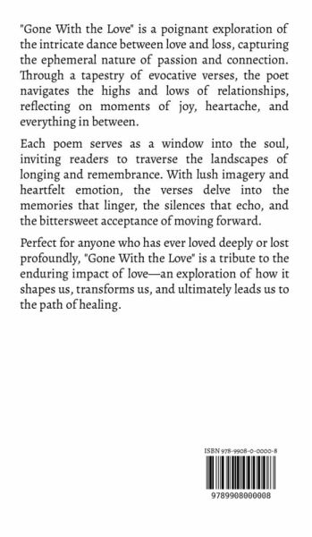 "Gone With the Love" is a poignant exploration of the intricate dance between love and loss, capturing the ephemeral nature of passion and connection. Through a tapestry of evocative verses, the poet navigates the highs and lows of relationships, reflecting on moments of joy, heartache, and everything in between. Each poem serves as a window into the soul, inviting readers to traverse the landscapes of longing and remembrance. With lush imagery and heartfelt emotion, the verses delve into the memories that linger, the silences that echo, and the bittersweet acceptance of moving forward. Perfect for anyone who has ever loved deeply or lost profoundly, "Gone With the Love" is a tribute to the enduring impact of love-an exploration of how it shapes us, transforms us, and ultimately leads us to the path of healing.