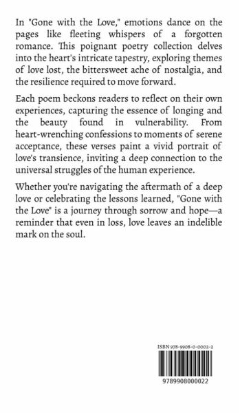 In "Gone with the Love," emotions dance on the pages like fleeting whispers of a forgotten romance. This poignant poetry collection delves into the heart's intricate tapestry, exploring themes of love lost, the bittersweet ache of nostalgia, and the resilience required to move forward. Each poem beckons readers to reflect on their own experiences, capturing the essence of longing and the beauty found in vulnerability. From heart-wrenching confessions to moments of serene acceptance, these verses paint a vivid portrait of love's transience, inviting a deep connection to the universal struggles of the human experience. Whether you're navigating the aftermath of a deep love or celebrating the lessons learned, "Gone with the Love" is a journey through sorrow and hope-a reminder that even in loss, love leaves an indelible mark on the soul.