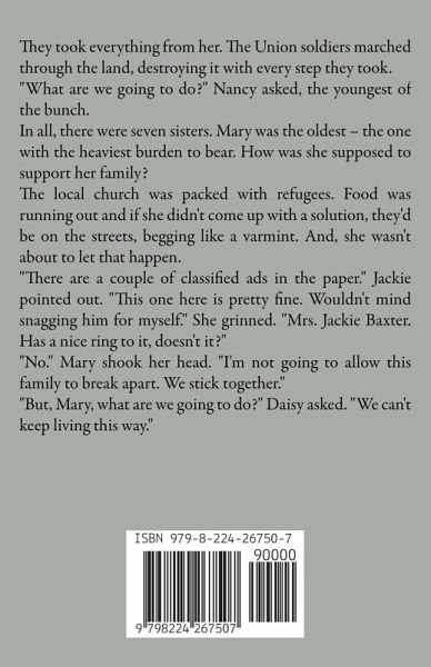 They took everything from her. The Union soldiers marched through the land, destroying it with every step they took. "What are we going to do?" Nancy asked, the youngest of the bunch. In all, there were seven sisters. Mary was the oldest - the one with the heaviest burden to bear. How was she supposed to support her family? The local church was packed with refugees. Food was running out and if she didn't come up with a solution, they'd be on the streets, begging like a varmint. And, she wasn't about to let that happen. "There are a couple of classified ads in the paper." Jackie pointed out. "This one here is pretty fine. Wouldn't mind snagging him for myself." She grinned. "Mrs. Jackie Baxter. Has a nice ring to it, doesn't it?" "No." Mary shook her head. "I'm not going to allow this family to break apart. We stick together." "But, Mary, what are we going to do?" Daisy asked. "We can't keep living this way."