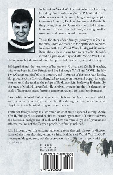 In the wake of World War II, one-third of East Germany, including East Prussia, was given to Poland and Russia with the consent of the four allies governing occupied Germany-America, England, France, and Russia. In the process, 14 million Germans who called that area home were driven from their land, receiving horrible treatment and never allowed to return. This is the story of one family's journey to safety and the miracles of God that lined their path to deliverance. In Gone with the World Wars, Hildegard Bonacker Bruni shares the inspiring true account of her family's incredible passage during and after World War II and the amazing faithfulness of God that protected them every step of the way. Hildegard shares the testimony of her parents, Gustav and Emilie Bonacker, who were born in East Prussia and lived through WWI and WWII. In July 1944, Gustav was drafted into the army, and in August of the same year, Emilie, along with seven of her children, had to escape on horse and buggy for eight months until she reached the refuge of Sophienhof, in Schleswig Holstein. By the grace of God, Hildegard's family survived, overcoming the life-threatening trials of hunger, sickness, freezing temperatures, and constant bomb attacks. Gone with the World Wars documents this brave family's experiences, which are representative of many German families during the time, revealing what they lived through both during and after the war. With her family's story as a reflection of what truly happened during World War II, Hildegard dedicated her life to uncovering the truth of both world wars, the historical background of each, and how the various types of government affected the lives of the German people, her family included. Join Hildegard on this unforgettable adventure through history to discover some of the most shocking unknown historical facts of World War II, God's incomparable goodness, and the European way of life that is gone with the world wars.