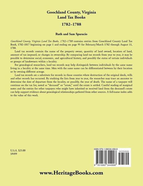 Goochland County, Virginia Land Tax Books, 1782-1788 contains entries from Goochland County Land Tax Book 1782-1817 beginning on page 1 and ending on page 95 for February/March 1782 through August 11, 1788. Land tax records contain the name of the property owner, quantity of land owned, location of land, amount of tax imposed, or changes in ownership. By comparing land tax records from year to year, it may be possible to determine social, economic, and agricultural history, and possibly the status of certain individuals or groups of landowners within a locality. For genealogical researchers, land tax records may help distinguish between individuals by the same name living in a locality at the same time. Men with the same name can be differentiated between by their location or by owning different acreage. Land tax records are a substitute for records in those counties where destruction of the original deeds, wills and other records has occurred. By studying the lists from year to year, the researcher may trace an ancestor to determine the date of departure from the locality, or possibly, the year of death. The name of a taxpayer will continue on the tax list, noted as "deceased" or "estate," until the estate is settled. Careful reading of marginal notes and the entries for other taxpayers who might have inherited or received land from the deceased's estate can help support evidence about genealogical relationships gathered from other sources. A full-name index adds to the value of this work. (1997), 2021, 8¿x11, paper, index, 112 pp