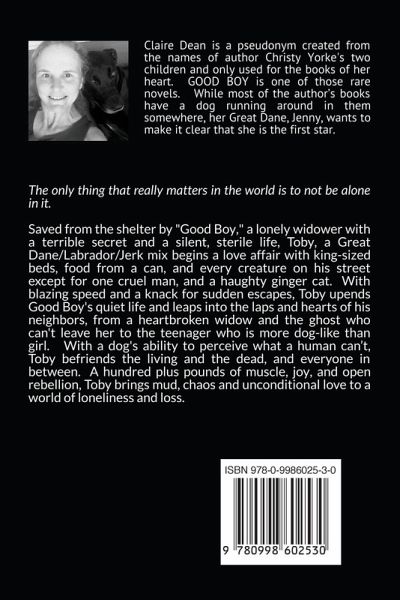 The only thing that really matters in the world is to not be alone in it. Saved from the shelter by "Good Boy," a lonely widower with a terrible secret and a silent, sterile life, Toby, a Great Dane/Labrador/Jerk mix begins a love affair with king-sized beds, food from a can, and every creature on his street except for one cruel man, and a haughty ginger cat. With blazing speed and a knack for quick escapes, Toby upends Good Boy's quiet life and leaps into the laps and hearts of his neighbors, from a heartbroken widow and the ghost who can't leave her to the teenager who is more dog-like than girl. With a dog's ability to perceive what a human can't, Toby befriends the living and the dead, and everyone in between. A hundred plus pounds of muscle, joy, and open rebellion, Toby brings mud, chaos and unconditional love to a world of loneliness and loss. Claire Dean, who also writes as Christy Yorke and Christy Cohen, is the author of 11 published novels, including Girlwood, Spirit Caller, and The Wishing Garden. She lives in Boise, Idaho with her husband, Robert, and Jenny, a Great Dane/Labrador/Jerk mix. The pseudonym Claire Dean is taken from the names of the author's two children, and only used when she writes the books of her heart. Good Boy is one of those rare novels. While most of the author's books have a dog running around in them somewhere, Jenny wants to make it clear that she is the first star.