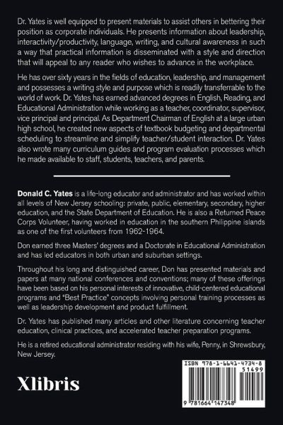 Dr. Yates is well equipped to present materials to assist others in bettering their position as corporate individuals. He presents information about leadership, interactivity/productivity, language, writing, and cultural awareness in such a way that practical information is disseminated with a style and direction that will appeal to any reader who wishes to advance in the workplace. He has over sixty years in the fields of education, leadership, and management and possesses a writing style and purpose which is readily transferrable to the world of work. Dr. Yates has earned advanced degrees in English, Reading, and Educational Administration while working as a teacher, coordinator, supervisor, vice principal and principal. As Department Chairman of English at a large urban high school, he created new aspects of textbook budgeting and departmental scheduling to streamline and simplify teacher/student interaction. Dr. Yates also wrote many curriculum guides and program evaluation processes which he made available to staff, students, teachers, and parents.