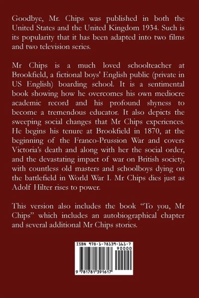 Goodbye, Mr. Chips was published in both the United States and the United Kingdom 1934. Such is its popularity that it has been adapted into two films and two television series. Mr Chips is a much loved schoolteacher at Brookfield, a fictional boys' English public (private in US English) boarding school. It is a sentimental book showing how he overcomes his own mediocre academic record and his profound shyness to become a tremendous educator. It also depicts the sweeping social changes that Mr Chips experiences. He begins his tenure at Brookfield in 1870, at the beginning of the Franco-Prussion War and covers Victoria's death and along with her the social order, and the devastating impact of war on British society, with countless old masters and schoolboys dying on the battlefield in World War I. Mr Chips dies just as Adolf Hilter rises to power. This version also includes the book "To you, Mr Chips" which includes an autobiographical chapter and several additional Mr Chips stories.