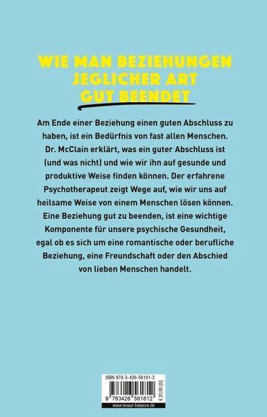 Der Psychotherapeut Dr. Gary McClain zeigt in seinem hilfreichen Ratgeber, wie man auf eine gute Weise loslassen und einen guten Abschluss finden kann. Der Begriff "Closure" ist inzwischen weit verbreitet in Social Media. Wir möchten nicht nur irgendwie eine Beziehung beenden, sondern sie wirklich gut beenden. Eine für beide Seiten befriedigende Aussprache zu haben und einen sauberen Schlussstrich zu ziehen, ist ein Bedürfnis von fast allen Menschen. Aber was ist ein wirklich guter Abschluss? Warum scheinen wir ihn immer so sehr zu wollen? Und wie können wir damit umgehen, wenn wir ihn nicht bekommen?