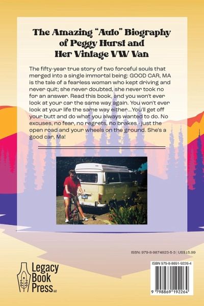 The Amazing "Auto" Biography of Peggy Hurst and Her Vintage VW Van. The fifty-year true story of two forceful souls that merged into a single immortal being: GOOD CAR, MA is the tale of a fearless woman who kept driving and never quit; she never doubted, she never took no for an answer. Read this book, and you won't ever look at your car the same way again. You won't ever look at your life the same way either...You'll get off your butt and do what you always wanted to do. No excuses, no fear, no regrets, no brakes - just the open road and your wheels on the ground. She's a good car, Ma!