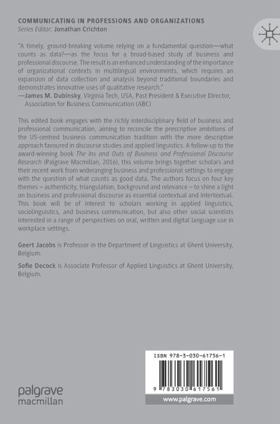 This edited book engages with the richly interdisciplinary field of business and professional communication, aiming to reconcile the prescriptive ambitions of the US-centred business communication tradition with the more descriptive approach favoured in discourse studies and applied linguistics. A follow-up to the award-winning book The Ins and Outs of Business and Professional Discourse Research (Palgrave Macmillan, 2016), this volume brings together scholars and their recent work from wide-ranging business and professional settings to engage with the question of what counts as good data. The authors focus on four key themes - authenticity, triangulation, background and relevance - to shine a light on business and professional discourse as essential contextual and intertextual. This book will be of interest to scholars working in applied linguistics, sociolinguistics, and business communication, but also other social scientists interested in a range of perspectives on oral, written and digital language use in workplace settings.