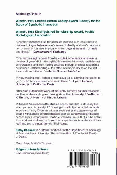 A compelling book on chronic illness and the effect it has on the self-concepts of those who suffer. It will appeal to anyone facing a long-term problem that seems beyond control. Kathy Charmaz's work is based on interviews with people suffering from such diseases as cancer, multiple sclerosis, and arthritis, and with their caregivers.
